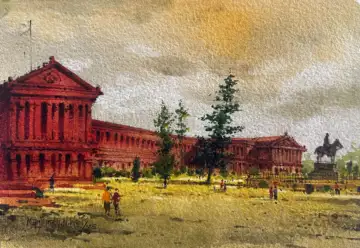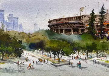 Before the postcard, I was part of a stamp-sized group show where I did a Hampi series. This was part of a stamp show organised by The Chennai Art Foundation. During that show, I met Bengaluru-based art historian Anil Kumar. He suggested I start a series on Bengaluru sites and historical places. Then, when I travelled to Bengaluru, I used to go to these spots and make many plein air artworks. Sometimes I do plein air watercolour work and complete some of it on the spot. And when I came back to the studio again, I was recording all of that - adding and deleting. This is how I went from the stamp-size to a postcard.
