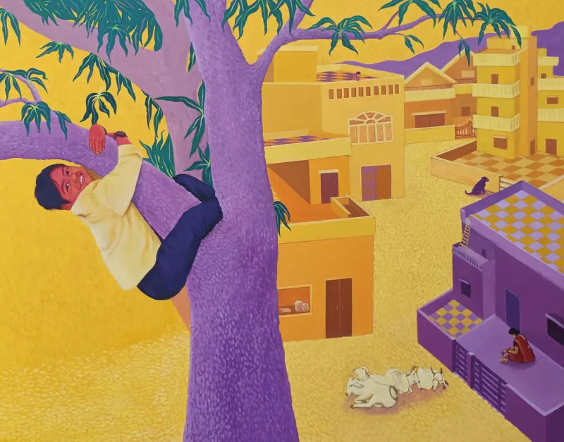 Several artists employ graphic language as a means of storytelling. Priyesh T draws from urban visual culture to produce bold illustrations rich with character and narrative. Sanatan Vatsayan approaches mark-making through influences drawn from graffiti and bodily movement, echoing the instinctive gestures of childhood drawing. Meanwhile Raj Chowdhury moves between abstraction and figuration, layering text and painterly marks to map emotional states.