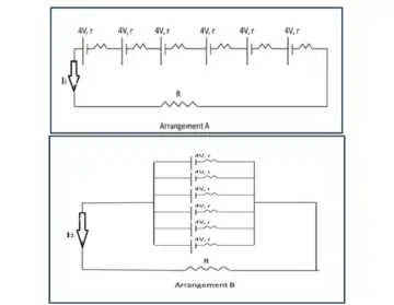 5 | Sheetal had 6 identical cells, each of electromotive force (emf) 4 V and internal resistance 'r'. She connected them to an external resistor 'R' in two different arrangements as shown and measured the current as 'I1' and 'I2' respectively.
