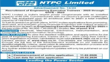 February 11, 2026 onwards. Under the recruitment drive, a total of 515 vacancies are to be filled through GATE-2025 score under the recruitment drive. Interested candidates can apply online starting from February 11, 2026, through the official NTPC careers website. Candidates selected finally for the Engineer Trainee posts will get pay scale of Rs. 40,000-1,40,000 (E1 Grade). Candidates having requisite educational qualification as mentioned in the notification can apply online for these posts on or before February 25, 2026. The online application process will be commenced form February 11, 2025.