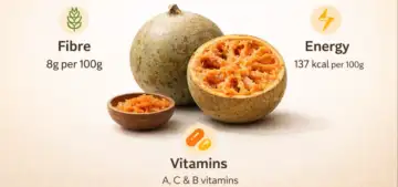 The balance feels just right for hot-weather eating habits.Below is a quick look at the calories in wood apple and its key components:Nutritional ComponentApproximate Value (Per 100g)Why It MattersCalories130 to 140 kcalProvides steady energy without heavinessCarbohydrates30 to 32 gSupports energy levels during long, hot daysDietary Fibre2 to 3 gHelps digestion and keeps the gut activeVitamin C8 to 60 mg per 100 g of pulpSupports immunity and skin healthCalcium80 to 90 mgContributes to bone strengthPotassium500 to 600 mgHelps maintain hydration balanceThe nutrients in wood apple work together to support digestion and hydration.