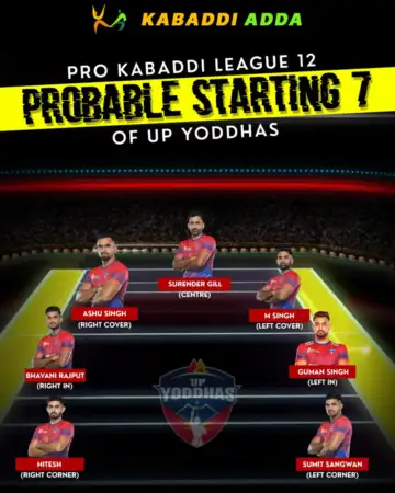 This probable playing 7 for PKL 12 highlights the UP Yoddhas' focus on a balanced strategy. With Guman Singh, Bhavani Rajput, and Surender Gill leading the raids, and Ashu Singh, Mahender Singh, Hitesh, and Sumit Sangwan anchoring the defense, the team is ready to face tough opponents.