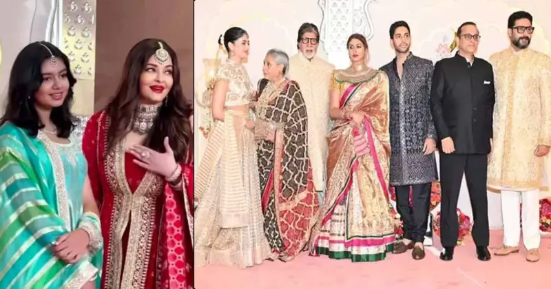 One saw Amitabh Bachchan and Jaya, Navya, Shweta, Abhishek, Agastya, and Nikhil Nanda arrive together at the Ambani wedding and pose on the red carpet. After a while, Aishwarya Rai appeared with her daughter Aaradhya and posed for the paps.