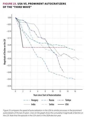 The report underscores that the gains of the "third wave of democratization" beginning in 1974 are being nearly erased, as electoral autocracies increasingly dominate the global political landscape.