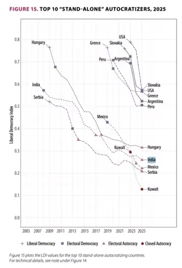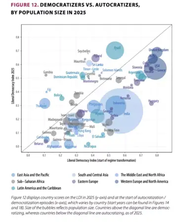 Among the world's five most populous countries, four-India, China, Indonesia, and Pakistan-are autocracies. The report notes that the United States, under Donald Trump, is rapidly moving toward autocracy, marking the first time in 50 years it no longer qualifies as a liberal democracy.