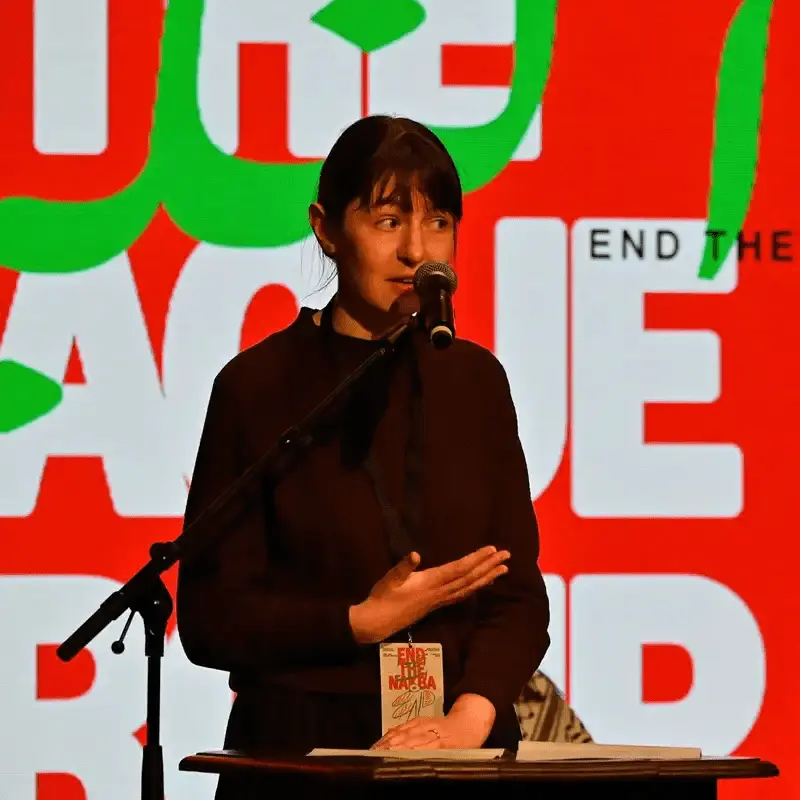 Many of the delegates here this weekend have faced serious personal and organisational retribution for their work. And I want to take a moment to thank those of our colleagues, especially those working in the global south and most especially our Palestinian comrades, who have persisted in the face of legal persecution, harassment, and state violence. We know that the extent to which resistance is effective can be measured by the degree of official repression that it provokes. And we know how many of the heroes of this movement have been imprisoned for their work. For those of us who are lucky enough to be here today, especially those of us who are not Palestinian, there is always more we can do.