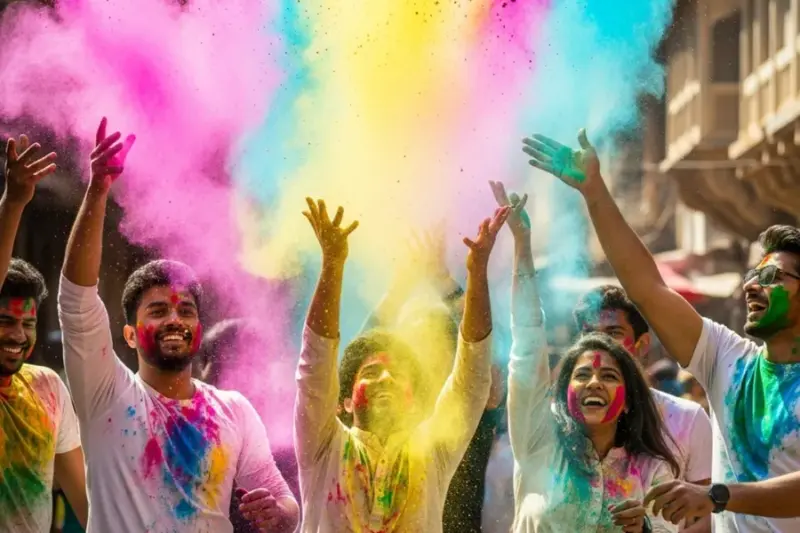 As part of celebrations, women from Barsana greet the visiting men with coloured powders, laughter and symbolic stick blows, continuing a ritualised form of playful retaliation rooted in mythology.