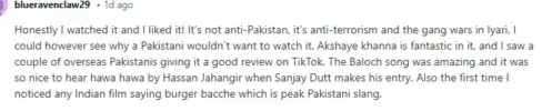One user reacted, "Honestly I watched it and I liked it! It's not anti-Pakistan, it's anti-terrorism and the gang wars in lyari. I could however see why a Pakistani wouldn't want to watch it. Akshaye khanna is fantastic in it, and I saw a couple of overseas Pakistanis giving it a good review on TikTok. The Baloch song was amazing and it was so nice to hear hawa hawa by Hassan Jahangir when Sanjay Dutt makes his entry. Also the first time I noticed any Indian film saying burger bacche which is peak Pakistani slang."