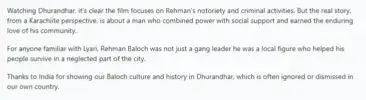 One user commented, "With all respect to the neighbour I wanted to share my pov of the character of Dhurandhar movie Rehman Dakait played by Akshay Khanna. Growing up in Karachi, I witnessed the stories of Lyari and its history. As a Baloch whose family has political roots in the Lyari, I want to share my perspective on Rehman Dakait not as a glorification of crime, but as a reflection of his unique impact on the community. Watching Dhurandhar, it's clear the film focuses on Rehman's notoriety and criminal activities. But the real story, from a Karachiite perspective, is about a man who combined power with social support and earned the enduring love of his community. For anyone familiar with Lyari, Rehman Baloch was not just a gang leader he was a local figure who helped his people survive in a neglected part of the city. Thanks to India for showing our Baloch culture and history in Dhurandhar, which is often ignored or dismissed in our own country."