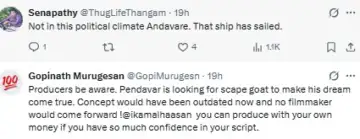 Another user commented, "Producers be aware. Pendavar is looking for scape goat to make his dream come true. Concept would have been outdated now and no filmmaker would come forward !@ikamalhaasan you can produce with your own money if you have so much confidence in your script."