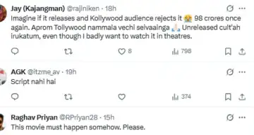 One user said, "Imagine if it releases and Kollywood audience rejects it 98 crores once again. Aprom Tollywood nammala vechi seivaainga Unreleased cult'ah irukatum, even though I badly want to watch it in theatres."