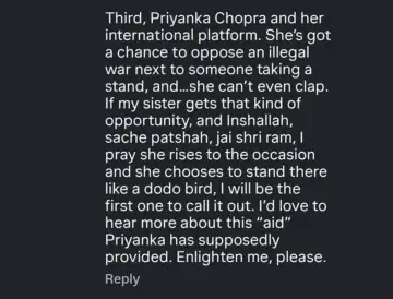 She then went on to call out Priyanka Chopra who stood silent during the Oscars 2026 presentation and wrote, "She's got a chance to oppose an illegal war next to someone taking a stand, and… she can't even step up. If my sister gets that kind of opportunity, and Inshallah, sachhe patshah, jai shri ram, I pray she rises to the occasion and she chooses to stand there like a dodo bird, I will be the first one to call it out."