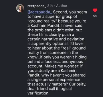 The person wrote, "Came across your account through Aneet (I genuinely admire her work), and honestly, your takes were surprising. Calling films like Kashmir Files, Kerala Story or even Dhurandhar "propaganda" just because they don't fit your narrative feels dismissive, especially when they're rooted in real or inspired events. Disagreeing is fine, but denying lived realities isn't…And if you expect Priyanka to take a stand on Palestine, (she's done more for Palestine by providing aid etc) maybe encourage Aneet to do the same as she steps into a global platform. Accountability shouldn't be selective."