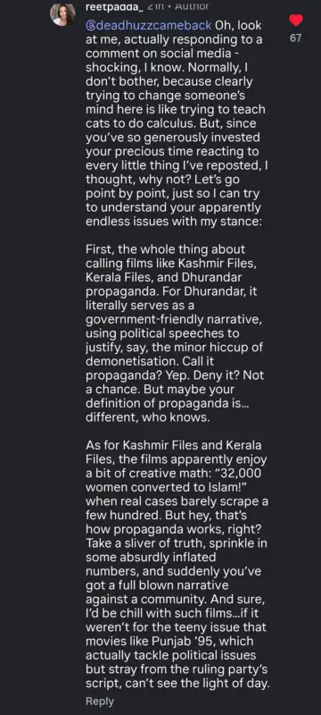 It so happened that a social media user questioned Reet Padda over her earlier post criticising politically charged movies like Dhurandhar.