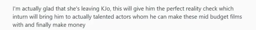 Another user commented, "I'm actually glad that she's leaving KJo, this will give him the perfect reality check which inturn will bring him to actually talented actors whom he can make these mid budget films with and finally make money."
