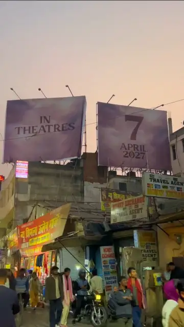Social media is buzzing with pictures of mysterious hoardings all around the city of Varanasi with just "In Theatres" and "7 April 2027" written on hoardings side by side.