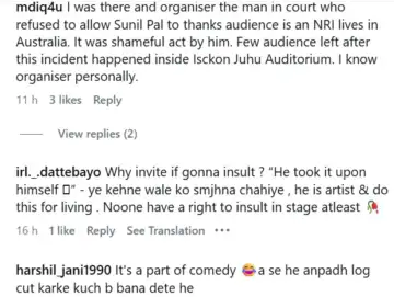 One user reacted, "I was there and organiser the man in court who refused to allow Sunil Pal to thanks audience is an NRI lives in Australia. It was shameful act by him. Few audience left after this incident happened inside Isckon Juhu Auditorium. I know organiser personally."