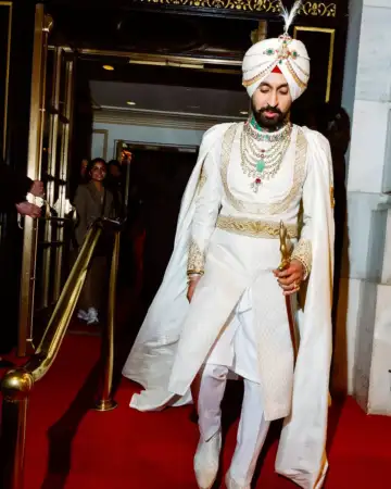 Prabal designed a sherwani-inspired angrakha in a crisp ivory palette for Diljit, layered with a regal cape, matching trousers, and a traditional turban (pag). The look was accentuated with rich jewellery that made him look like he had just stepped out of a royal portrait.