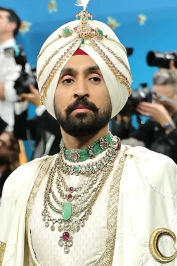 While the original jewel remains sealed in a museum vault, Diljit's stylist Abhilasha Devnani collaborated with Golecha's, an Indian jewellery house, to craft bespoke jewellery pieces that echoed the Maharaja's grandeur. Layers of emeralds, pearls, ornate brooches, and a turban ornament added a regal shimmer to the ensemble.