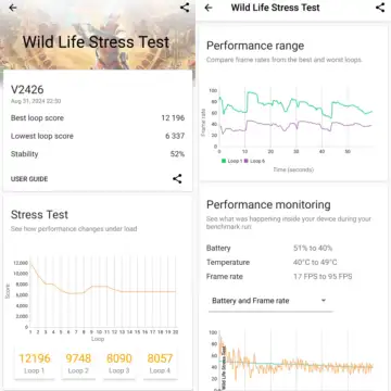 On Geekbench 6, the T3 Ultra recorded a single-core score of 2,064 and a multi-core score of 5,621. Additionally, it achieved a best loop score of 12,196 with 52% stability on 3DMark's Wild Life Stress Test. The phone did heat up noticeably during the 3DMark test, but I didn't observe similar heating issues during everyday use.