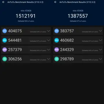 The T3 Ultra runs on the MediaTek Dimensity 9200+ processor, which is comparable to-or even better than-other phones in the ₹30,000 price bracket. While Vivo claims an Antutu score exceeding 1.6 million, the T3 Ultra achieved scores between 1.4 and 1.5 million during my testing period. In terms of competition, the OnePlus Nord 4 (Snapdragon 7+ Gen 3) scored around 1.1 million on Antutu in my tests, while the Poco F6 (Snapdragon 8s Gen 3) reached approximately 1.4 million.