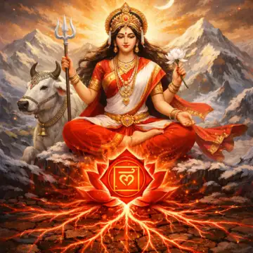 The Mooladhara (Root) Chakra is activated by Maa Shailaputri, providing grounding, stability, and the foundation for spiritual growth.