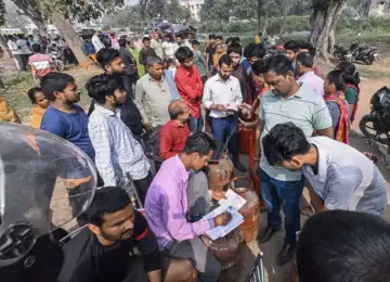 People gather to book domestic LPG cylinders at a gas agency amid an ongoing LPG supply shortage, in Patna on Friday, (ANI Photo)