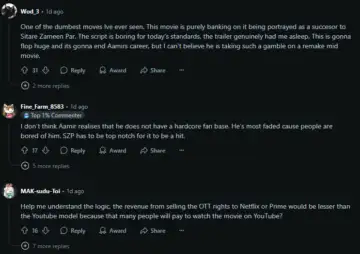 Another commented, "Help me understand the logic, the revenue from selling the OTT rights to Netflix or Prime would be lesser than the Youtube model because that many people will pay to watch the movie on YouTube?"