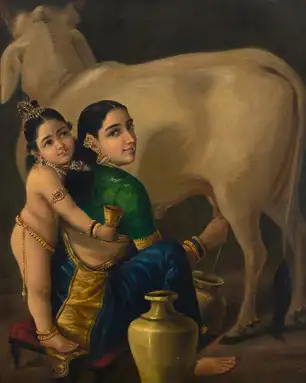 The painting Yashoda and Krishna shows a touching scene between mother Yashoda and young Lord Krishna. It captures a moment of love and care, highlighting the strong bond between a mother and child.