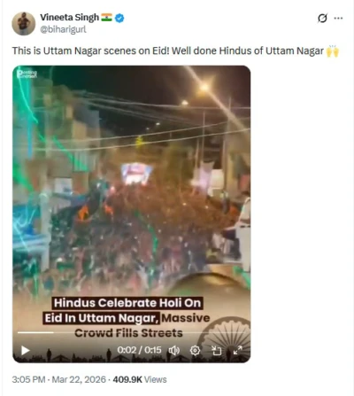 A video showing a large crowd waving saffron flags and dancing in the streets has gone viral on social media. Users claimed the visuals were from Uttam Nagar in Delhi, showing Hindus gathering in large numbers on Eid following the murder of Tarun Kumar, who was killed following a clash during Holi celebrations in Uttam Nagar.