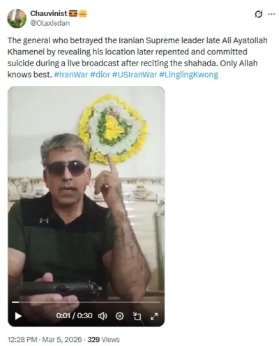 A video showing a man dying by suicide is going viral on social media with the claim that it shows an Iranian general who allegedly betrayed Supreme Leader Ayatollah Ali Khamenei, who was reportedly killed in the US-Israel airstrikes on February 28, 2026, by revealing his location.