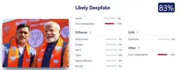 Viral imageWe then checked the viral image on multiple AI detection platforms to further ascertain whether the image is genuine or AI-generated. Website Sightengine found an 83% probability of the photo being a deepfake.