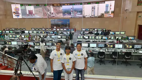Blue Blocks Montessori School students and founder Pavan Goyal at ISRO Mission Control during the PSLV-C62launch of their student-built satellite, January 2026