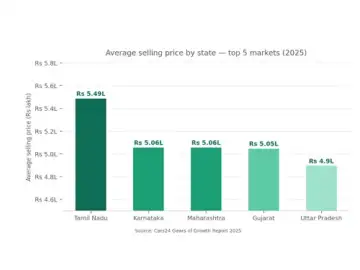 Average selling prices across the top five states in the Cars24 Gears of Growth Report reveal how vehicle mix and buyer profiles translate into spending patterns.