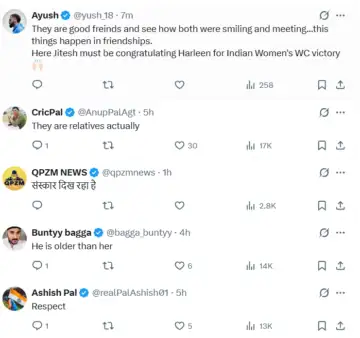 Jitesh strolled over, bat and gloves in hand, and bent down to touch Harleen's feet. She just grinned and gave him a friendly pat on the back. He was still in his training kit, while Harleen looked sharp in her full gear, sunglasses and all.