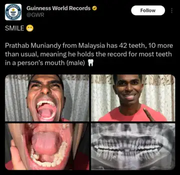 Surprisingly, the extra teeth have grown in a straight alignment and cause absolutely no discomfort. Muniandy maintains a strict oral hygiene routine by brushing twice daily and flossing regularly. He noted that people rarely notice his unique dental structure at first glance but are often left astounded when he reveals his record.