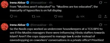 Irena Akbar, a former "journalist," sought to misrepresent the incident by implying that Muslims are being unfairly singled out for their education and taking job opportunities, which is not unusual for an extremist, who is known for distorting reality to suit her goal. She also criticised the female police personnel who went undercover at the firm to bust this syndicate, mocking that their attention should be on maintaining law and order rather than eavesdropping on private office discussions.