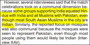 In essence, the researchers blamed 'Hindu communalism' which "reflects communalism in which all Muslims are Pakistanis, all Indians are Hindus, and the relations between them are seen as inherently antagonistic."