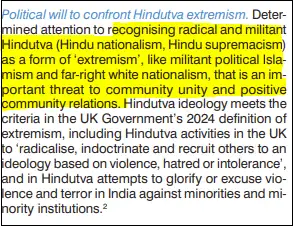 "Determined attention to recognising radical and militant Hindutva (Hindu nationalism, Hindu supremacism) as a form of 'extremism', like militant political Islamism and far-right white nationalism, that is an important threat to community unity and positive community relations," the report reads.