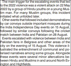 The tone and the framing of the events of the 2022 Leicester violence in the SOAS report essentially insinuates that it was Hindus who provoked, started, and escalated communal violence by victimising and terrorising 'peaceful' Muslims. The report's 'findings', or rather, a dishonest blend of 40 per cent facts and 60 per cent anti-Hindu narrative, come across as suggesting that whatever violent and offensive actions Muslims indulged in against Hindus were reactionary.