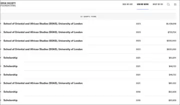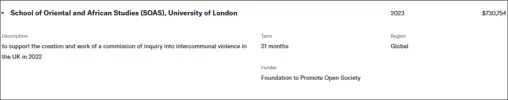 The Open Society Foundation has, in the last decade, made several grants to the SOAS University. As per the records available on OSF's website, the Foundation gave a grant of $730,754 in 2023 to the SOAS University for a 21-month term, to "support the creation and work of a commission of inquiry into intercommunal violence in the UK in 2022."