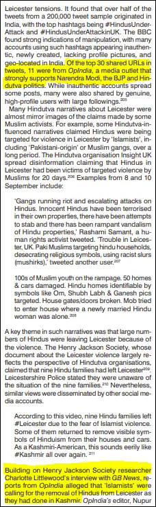 "Henry Jackson Society researcher Charlotte Littlewood's interview with GB News, reports from OpIndia alleged that 'Islamists' were calling for the removal of Hindus from Leicester as they had done in Kashmir," it adds.