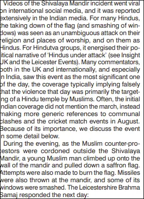 Distinguishing Hindus from Hindutva groups, the report said that while the local Hindus saw the Shivalaya Mandir incident as an attack on their religion, temples, and on them as Hindus, for 'Hindutva' groups, it energised their political narrative of 'Hindus under attack' (see Insight UK and the Leicester Events).