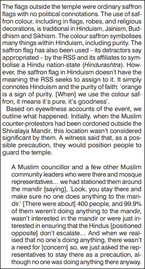 Citing 'eyewitness', the SOAS University report says that Muslim counter-protestors had gathered outside the Shivalaya Mandir to guard it and ensure that the Mandir remains unharmed. The report, however, did not comment on why Muslim protestors who gathered to oppose a Hindu protest march would deploy Muslim youths to 'guard' a Hindu temple from Hindus.