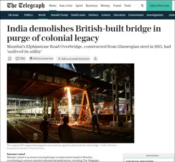 In continuation of weaving a misleading narrative to tarnish India's image, The Telegraph gave the demolition of Mumbai's 112-115-year-old Elphinstone Road Overbridge a 'British colonial legacy purge' spin. The propaganda piece headlined, "India demolishes British-built bridge in purge of colonial legacy", is authored by a Mumbai-based Kashmiri journalist, Samaan Lateef.