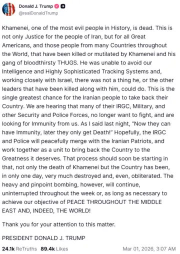 However, before the confirmation by the Iranian media, US President Donald Trump posted a lengthy message on Truth Social around 3:07 am on Friday (local time), celebrating Khamenei's death. Describing Khamenei as the "most evil person in History", Trump hailed his death as a mark of justice to the people of Iran, the "Great Americans", and all those who suffered during Khamenei's rule.