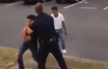Just when things seem under control, another man-this one in a white T-shirt-enters the frame. He's no bystander; he appears to be a friend of the detainee. And he's not there to calm things down.