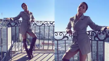 Alia Bhatt looked simply stunning in a grey blazer dress, which she teamed with her sassy and spectacular maroon thigh-high boots. This gave the whole outfit a color-blocked effect, enhancing its overall appeal. We loved the fact that the dress has a knot in the middle, right on the waist—this is exactly what gave it a touch of much-needed edge.