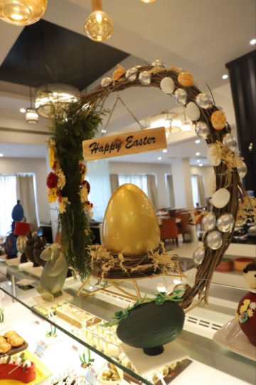 The experience concludes with festive treats including hot cross buns and chocolate egg nests, all complemented by family-friendly activities like live egg painting and a grand chocolate display.