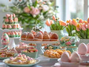 The celebration extends beyond the table with playful activities for all ages. Children can enjoy egg painting and a spirited Easter egg hunt, ensuring an afternoon of discovery and delight. Whether gathering with friends or family, this Easter celebration perfectly blends refined festive flavors with the spirited charm of the season in a vibrant, welcoming setting.